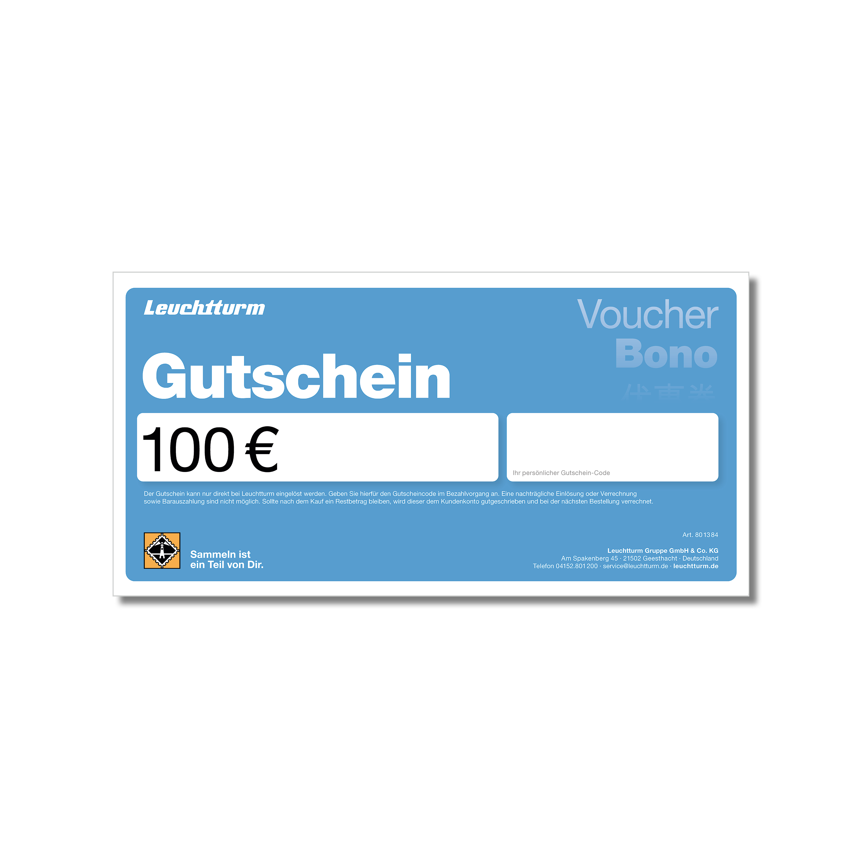 Avec le bon cadeau Leuchtturm, vous offrez une solution simple et flexible à tous les collectionneurs. Il convient parfaitement pour de nombreuses occasions, comme un anniversaire, un jubilé ou Noël, et peut être utilisé sur l’ensemble de l’assortiment Leuchtturm.