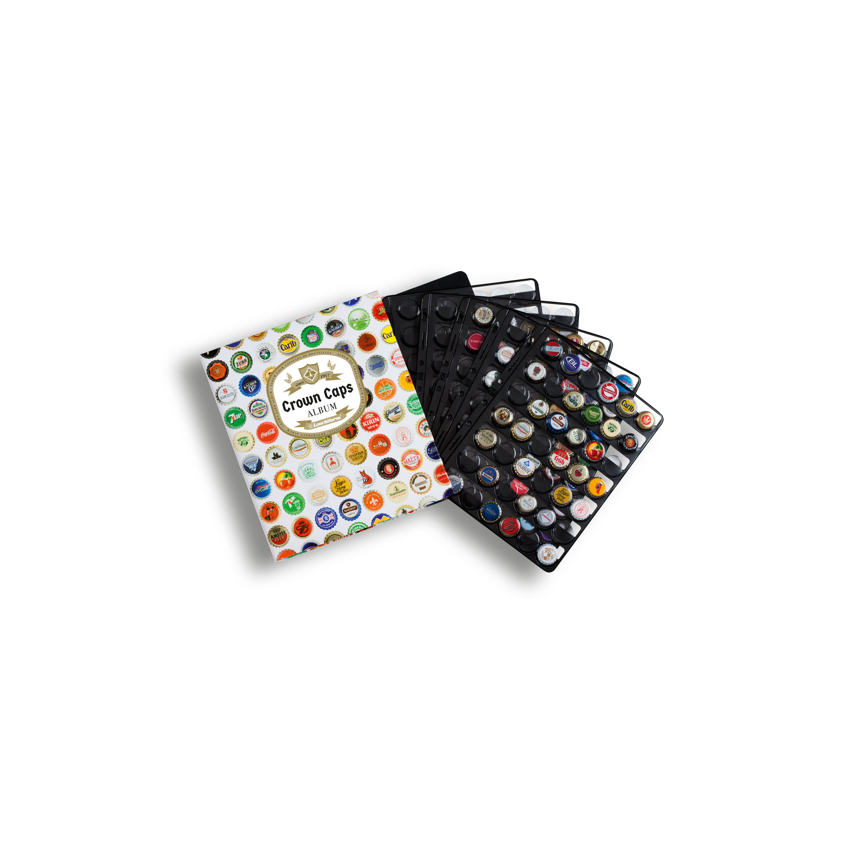 Album avec titre en anglais comprenant 5 feuilles pour classer 210 capsules de bière usagées et 5 intercalaires noirs. L’album peut être complété par des feuilles supplémentaires (contenance totale: 9 feuilles = 378 capsules de bière). Chaque feuille permet de classer 42 capsules de bière usagées et de les protéger contre les rayures. Insertion facile des capsules par l’arrière des feuilles.